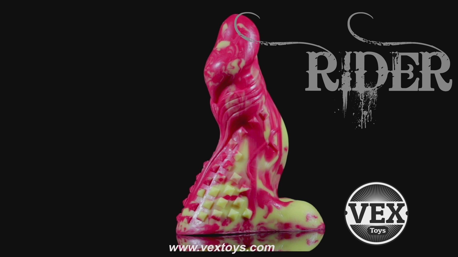 This toy was carved with various textures, spikes, ripples and valleys to give the user a variety of pleasureful sensations. Designed with a reverse 's' shaped curve to help hit those 'G' Spots, 'P' Spots or any desired spot. The 'Rider' has a 13'' width base with suction cup for hand held or surface grip.